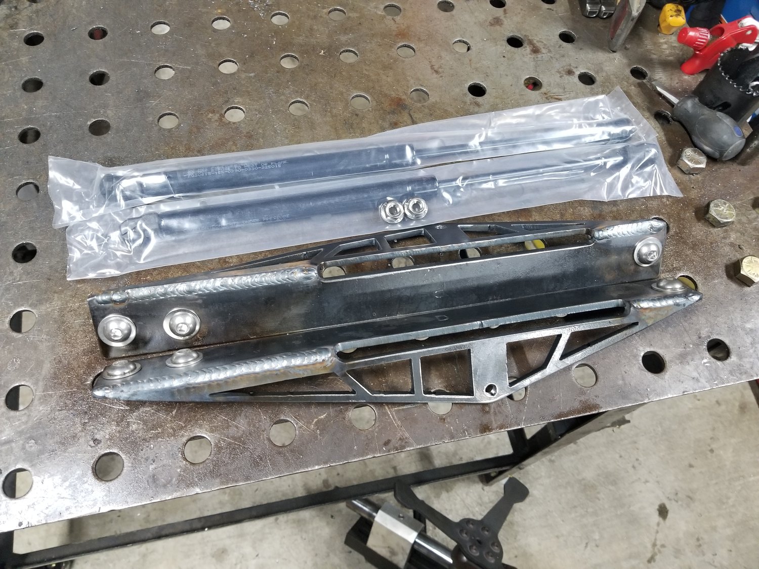 If you want to stop using a hood prop or anything to hold your hood up. This is a very easy bolt on hood kit. Comes with 316 grade Stainless steel hardware, Cnc Plasma Brackets, and gas struts.